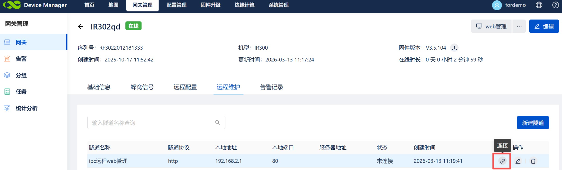 - 返回远程维护页面,在隧道列表中找到新建的隧道,点击操作列的连接按钮(圆形图标)。
