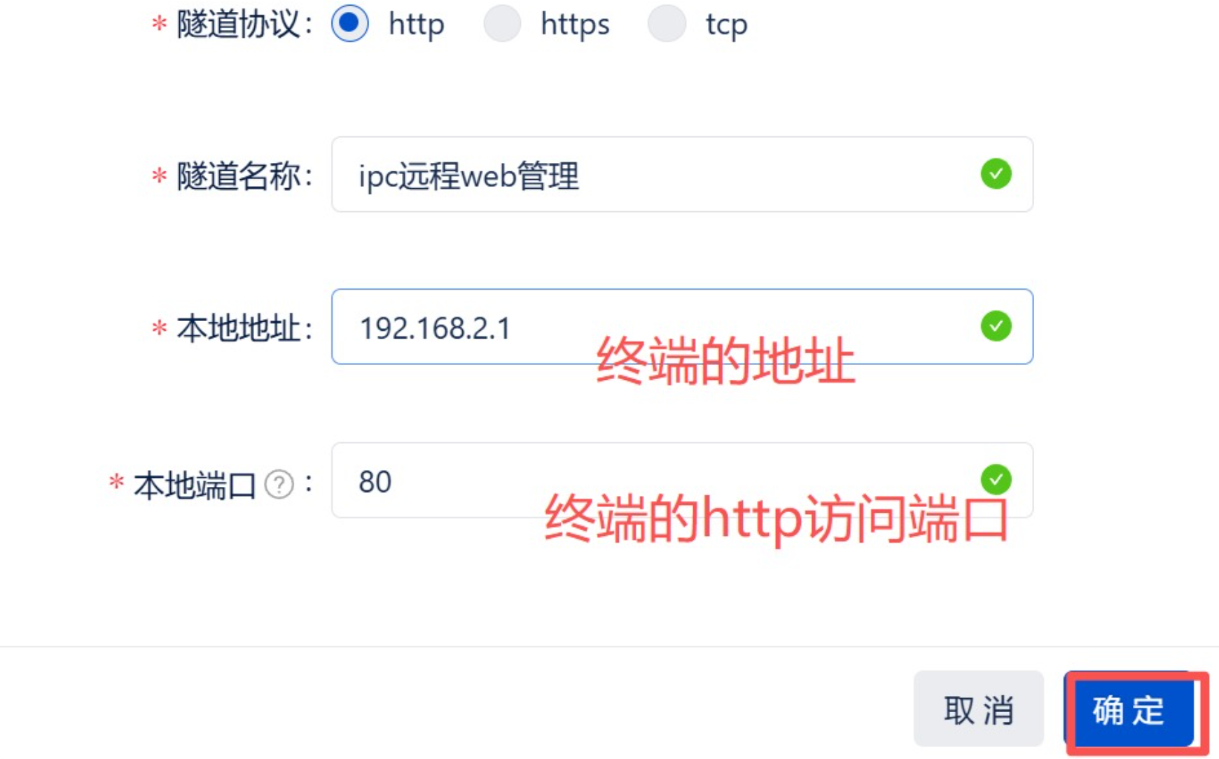 192.168.2.1)。 - •本地端口:填写终端服务对应的端口(示例HTTP服务为