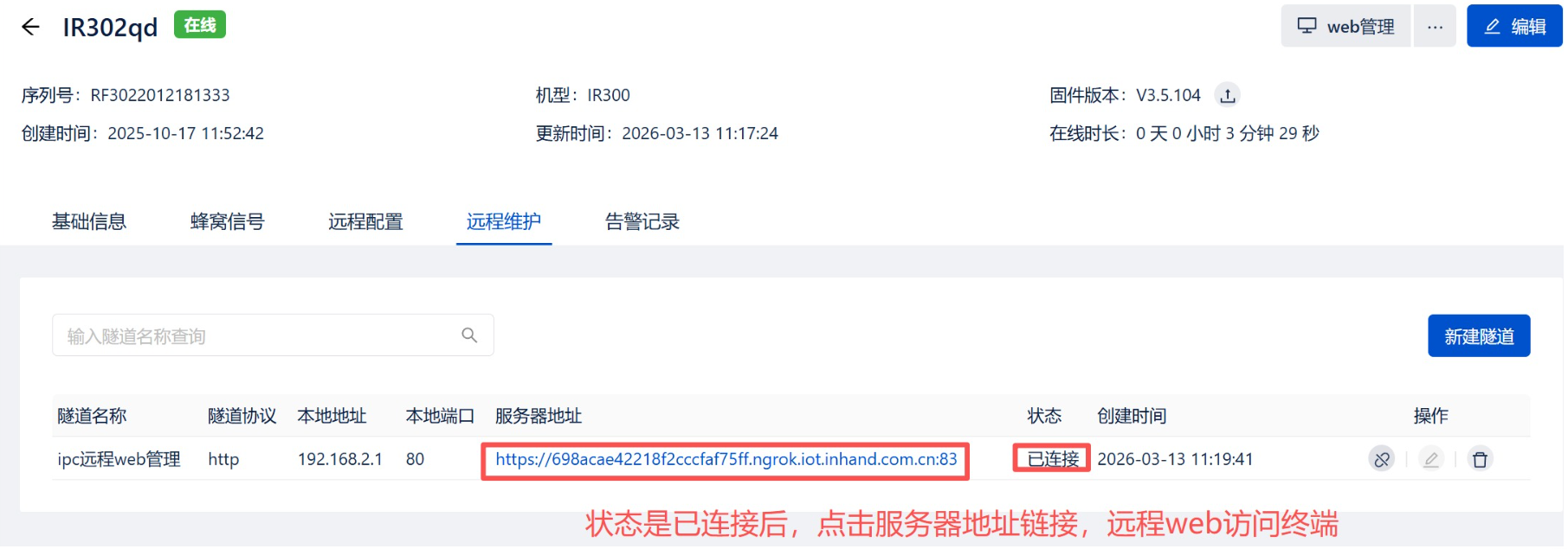 - 等待隧道状态变为已连接,此时系统会自动生成服务器地址(远程访问的公网链接)。